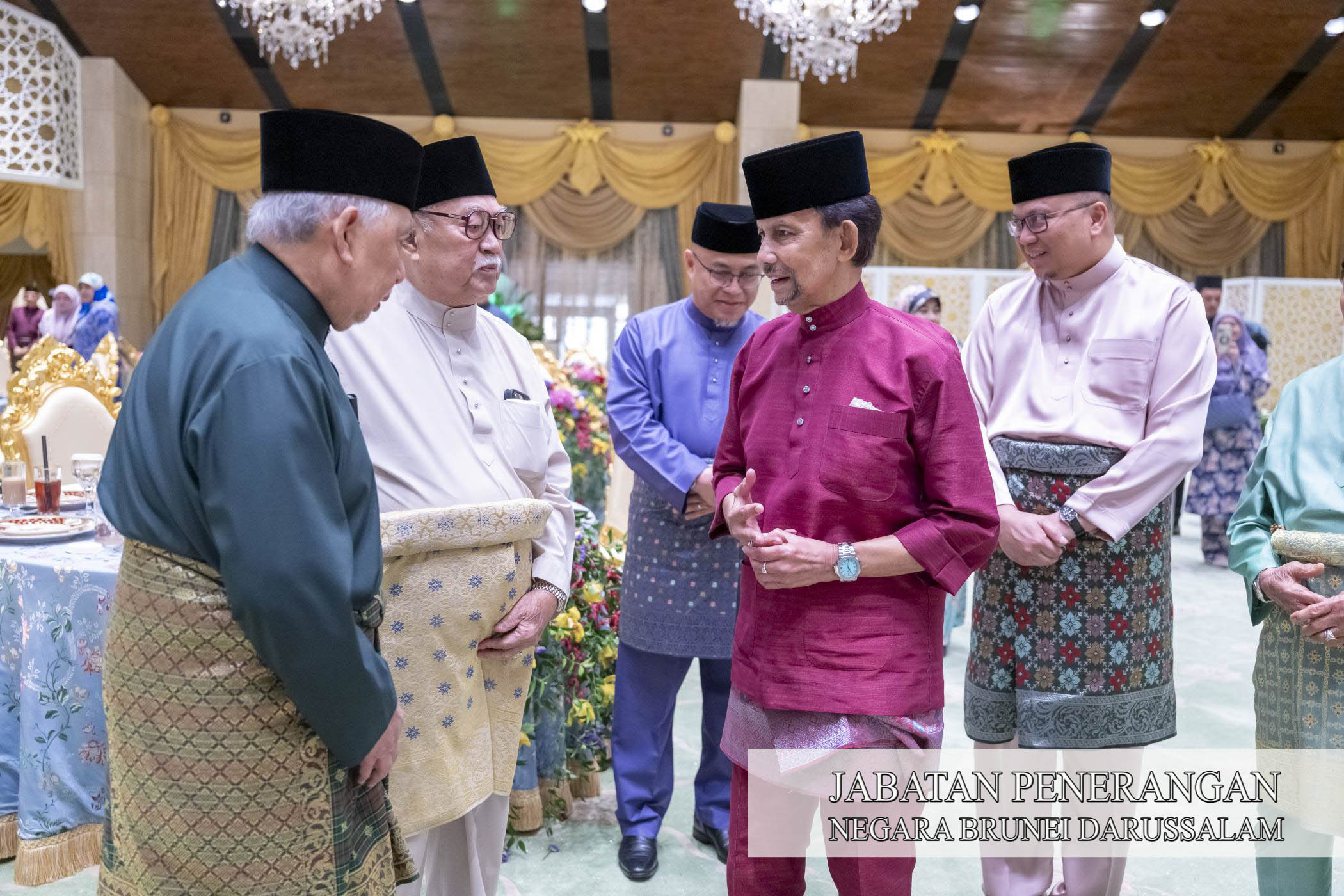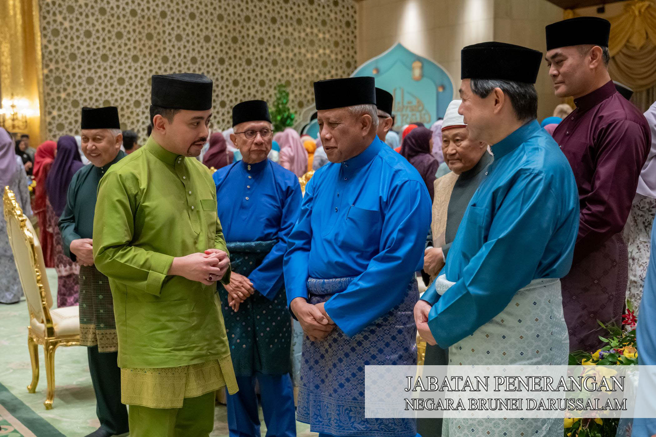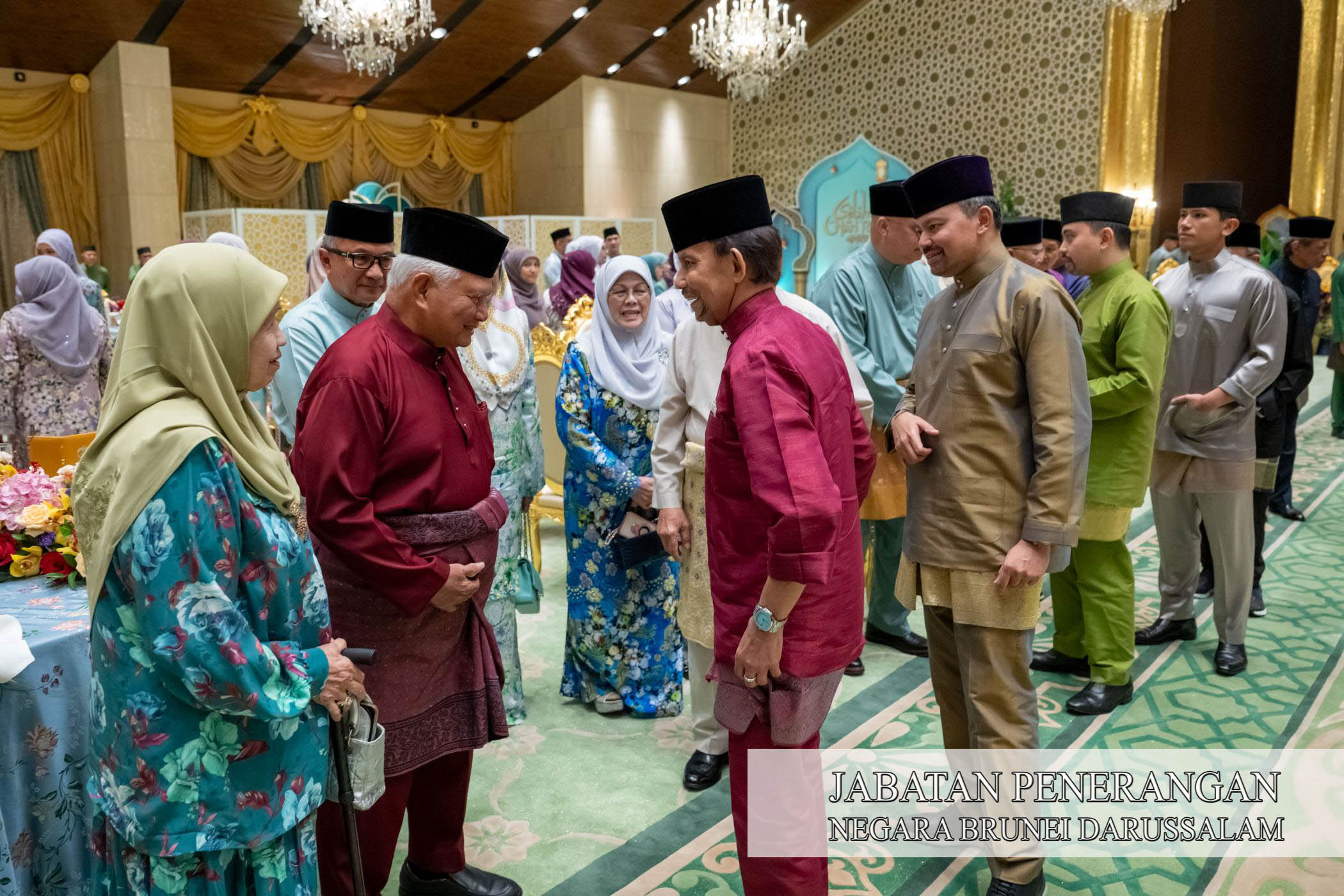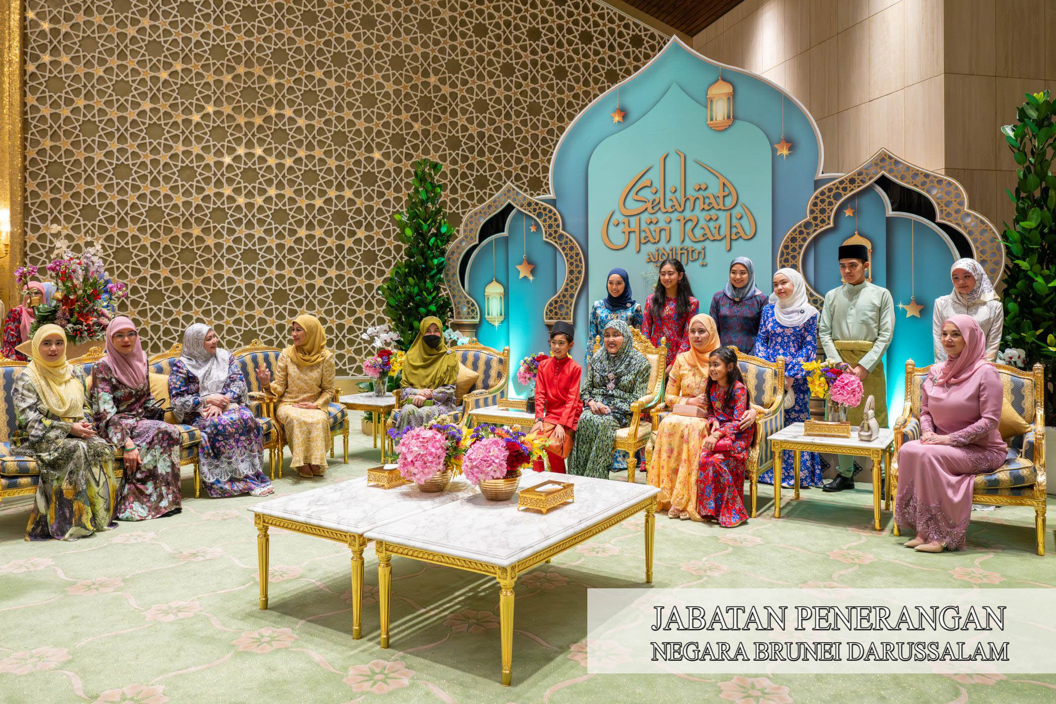 Sehubungan itu, kegembiraan dan kesyukuran Sambutan Hari Raya Aidilfitri 1447 Hijrah / 2026 Masihi telah dikongsi sama oleh Kebawah Duli Yang Maha Mulia Paduka Seri Baginda Sultan Haji Hassanal Bolkiah Mu'izzaddin Waddaulah ibni Al-Marhum Sultan Haji Omar 'Ali Saifuddien Sa'adul Khairi Waddien, Sultan dan Yang Di-Pertuan Negara Brunei Darussalam dan Kebawah Duli Yang Maha Mulia Paduka Seri Baginda Raja Isteri Pengiran Anak Hajah Saleha binti Al-Marhum Pengiran Pemancha Pengiran Anak Haji Mohamed Alam iaitu dengan berkenan menerima mengadap dan junjung ziarah Hari Raya Aidilfitri para pembesar negara yang terdiri daripada Yang Amat Mulia Pengiran-Pengiran Cheteria, Yang Berhormat Menteri-menteri Kabinet, Yang Mulia Timbalan-timbalan Menteri, Yang Berhormat Ahli-ahli Majlis Mesyuarat Negara, para diplomat serta perwakilan asing di negara ini, Setiausaha-setiausaha Tetap dan para pegawai kanan kerajaan bersama isteri masing-masing di Istana Nurul Iman, hari ini.