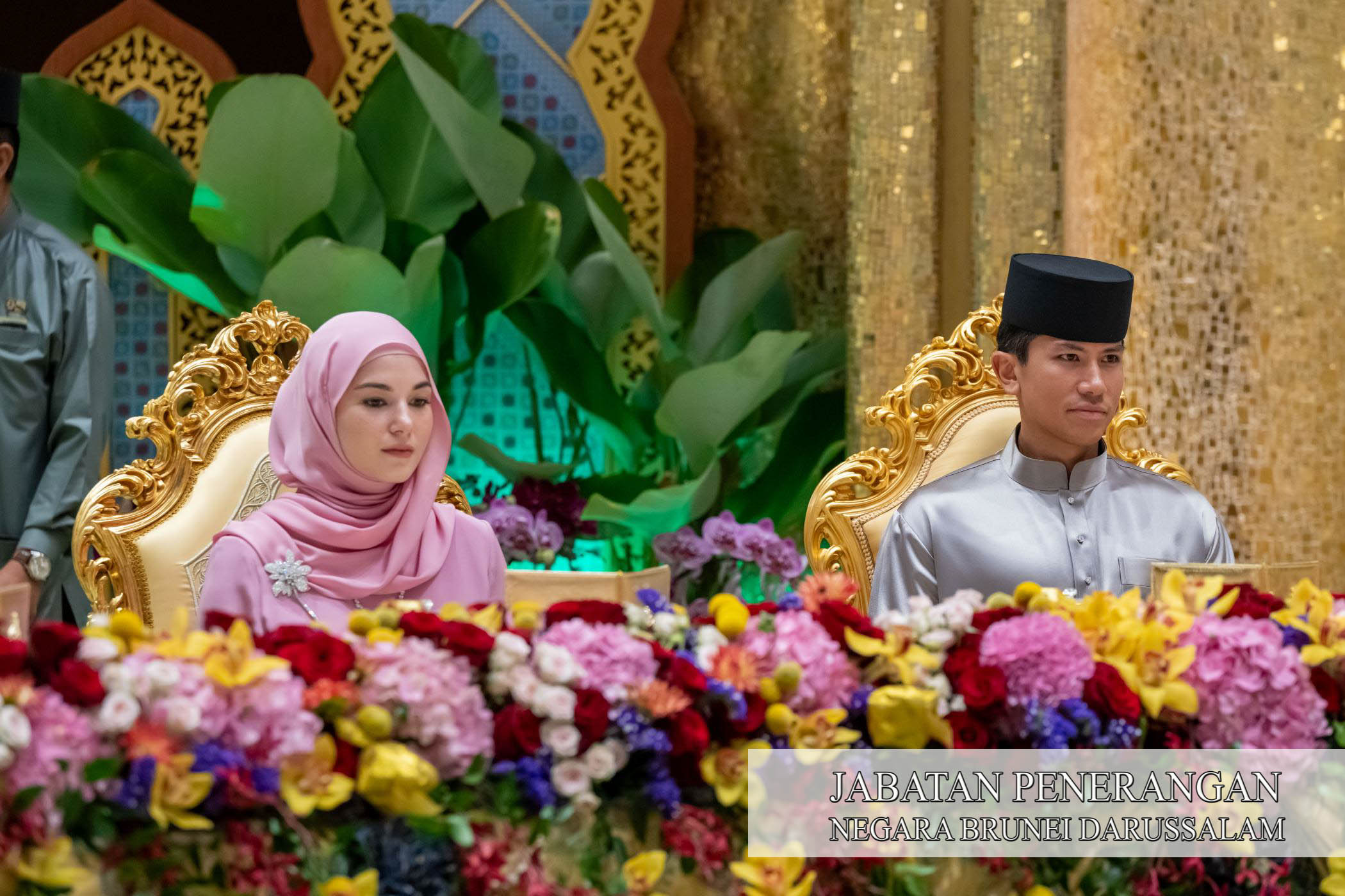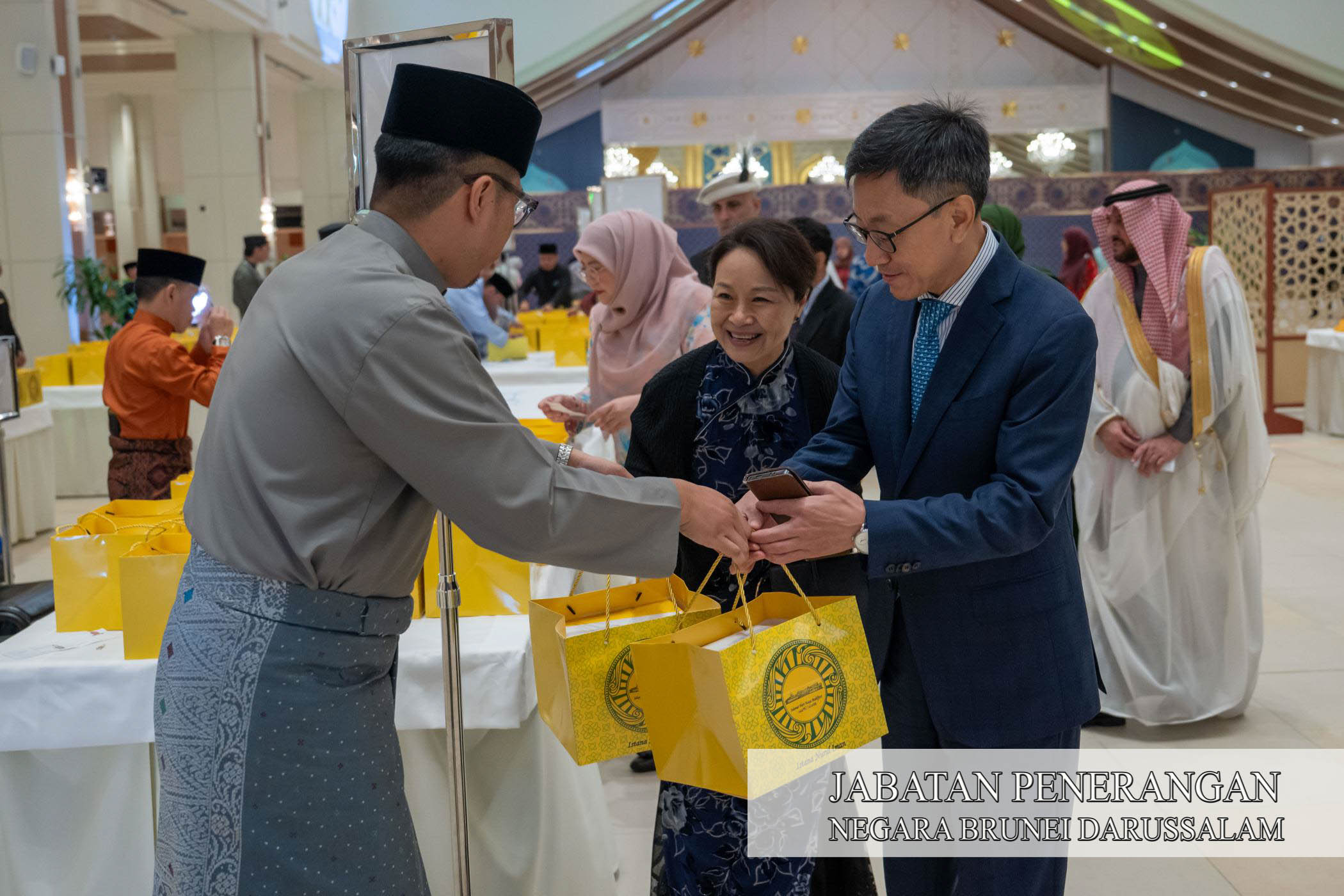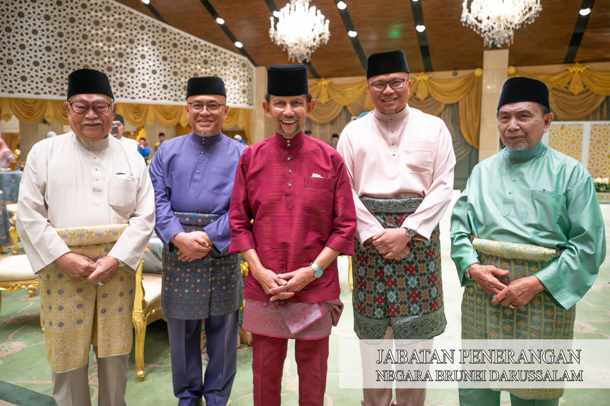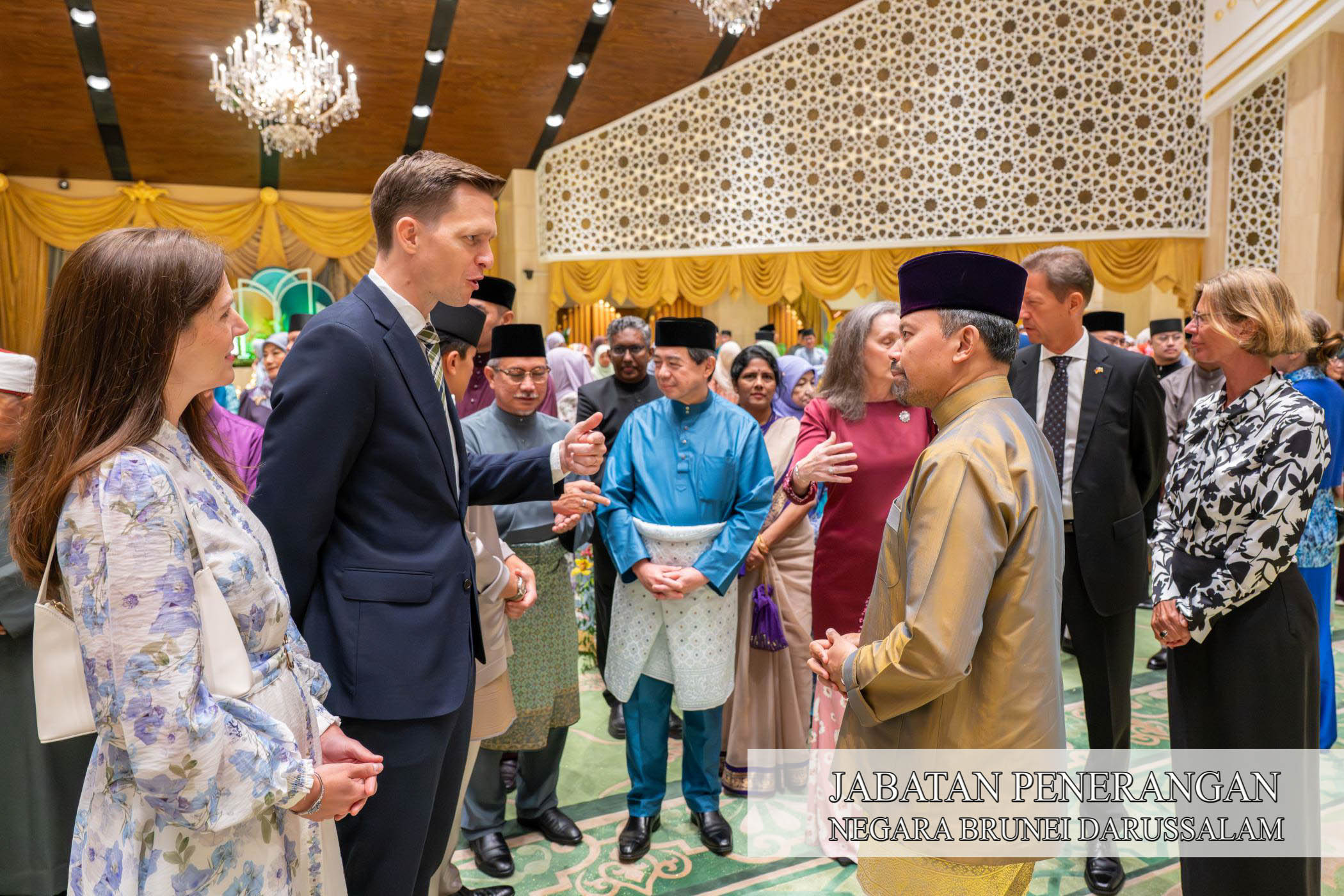 Sehubungan itu, kegembiraan dan kesyukuran Sambutan Hari Raya Aidilfitri 1447 Hijrah / 2026 Masihi telah dikongsi sama oleh Kebawah Duli Yang Maha Mulia Paduka Seri Baginda Sultan Haji Hassanal Bolkiah Mu'izzaddin Waddaulah ibni Al-Marhum Sultan Haji Omar 'Ali Saifuddien Sa'adul Khairi Waddien, Sultan dan Yang Di-Pertuan Negara Brunei Darussalam dan Kebawah Duli Yang Maha Mulia Paduka Seri Baginda Raja Isteri Pengiran Anak Hajah Saleha binti Al-Marhum Pengiran Pemancha Pengiran Anak Haji Mohamed Alam iaitu dengan berkenan menerima mengadap dan junjung ziarah Hari Raya Aidilfitri para pembesar negara yang terdiri daripada Yang Amat Mulia Pengiran-Pengiran Cheteria, Yang Berhormat Menteri-menteri Kabinet, Yang Mulia Timbalan-timbalan Menteri, Yang Berhormat Ahli-ahli Majlis Mesyuarat Negara, para diplomat serta perwakilan asing di negara ini, Setiausaha-setiausaha Tetap dan para pegawai kanan kerajaan bersama isteri masing-masing di Istana Nurul Iman, hari ini.