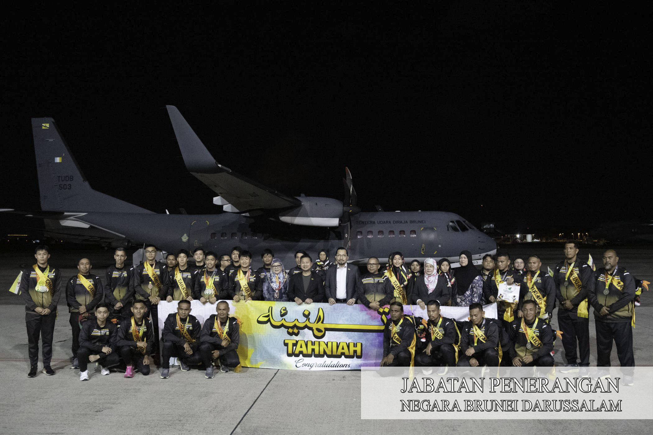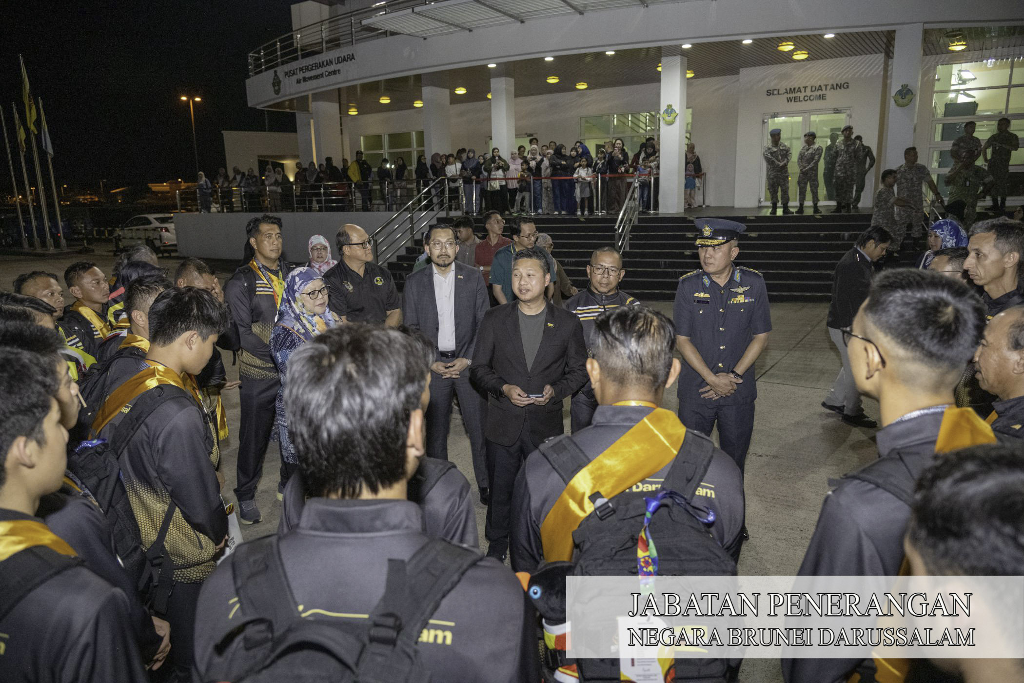 Hadir menyambut kepulangan kontinjen di Pusat Pergerakan Udara, Pangkalan Tentera Udara Brunei, di sini, Setiausaha Tetap (Kebudayaan), Kementerian Kebudayaan, Belia dan Sukan (KKBS), Pengiran Haji Mohd. Hasnan bin Pengiran Haji Ali Hassan serta pegawai-pegawai dari kementerian berkenaan.