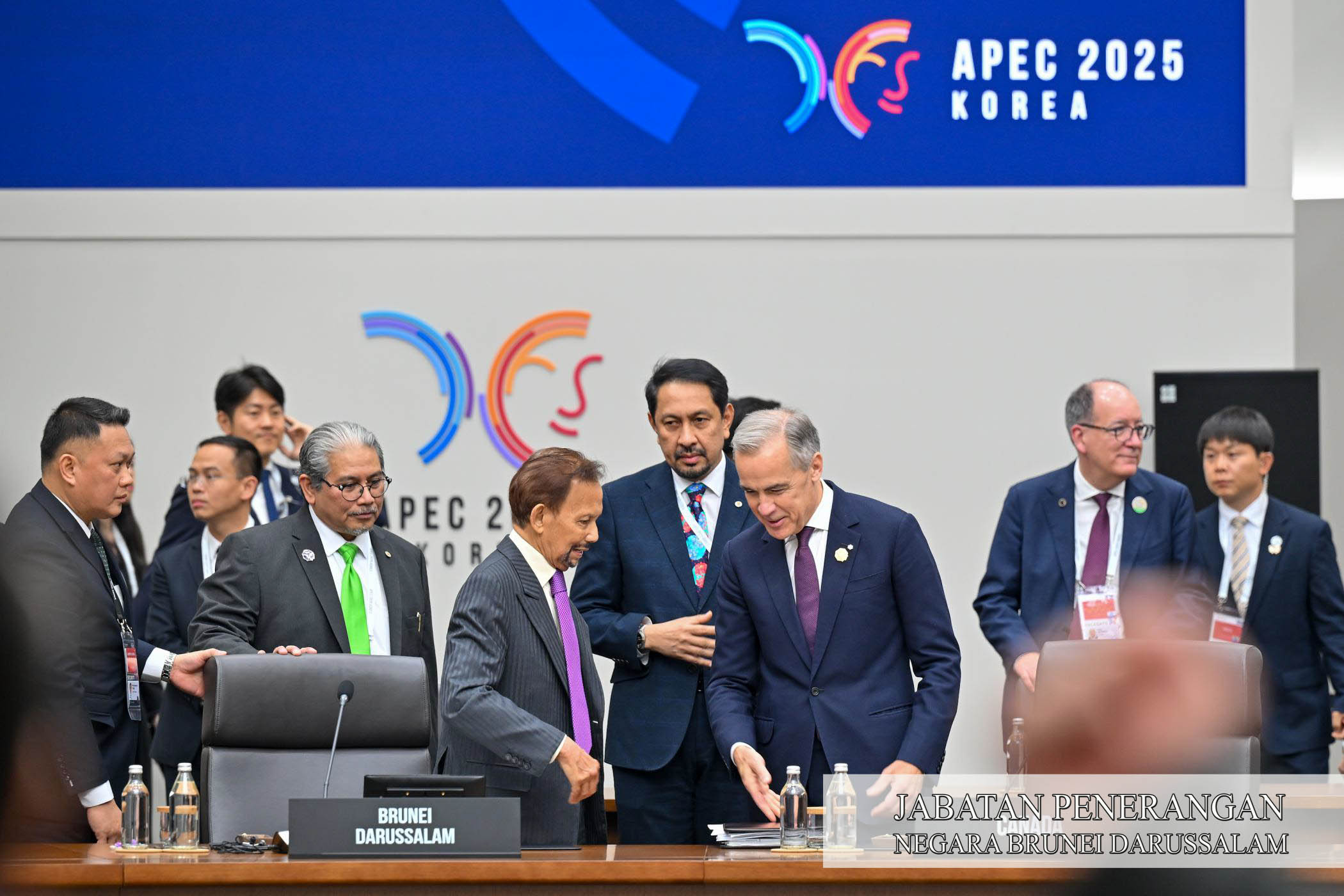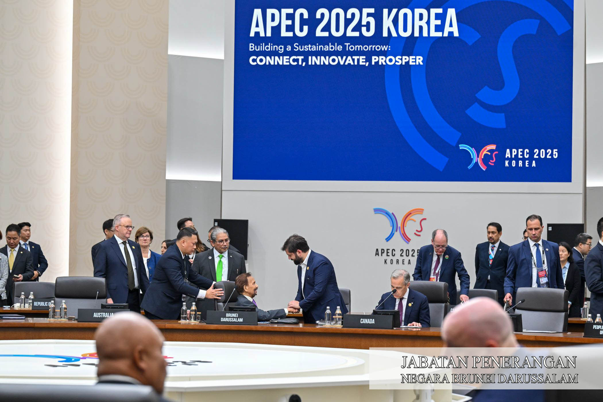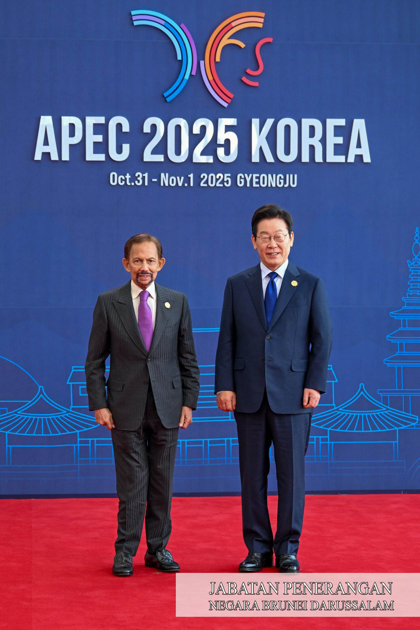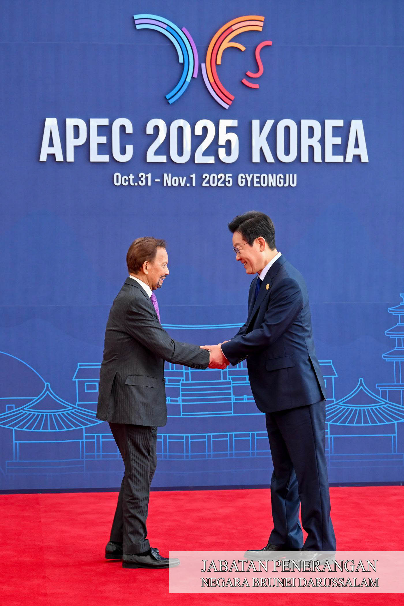 Keberangkatan tiba Kebawah Duli Yang Maha Mulia Paduka Seri Baginda Sultan dan Yang Di-Pertuan Negara Brunei Darussalam di Gyeongju Hwabaek International Convention Center (HICO) dialu-alukan oleh Presiden Republik Korea, Tuan Yang Terutama Lee Jae-myung, sebagai Pengerusi APEC Economic Leaders' Meeting (AELM).