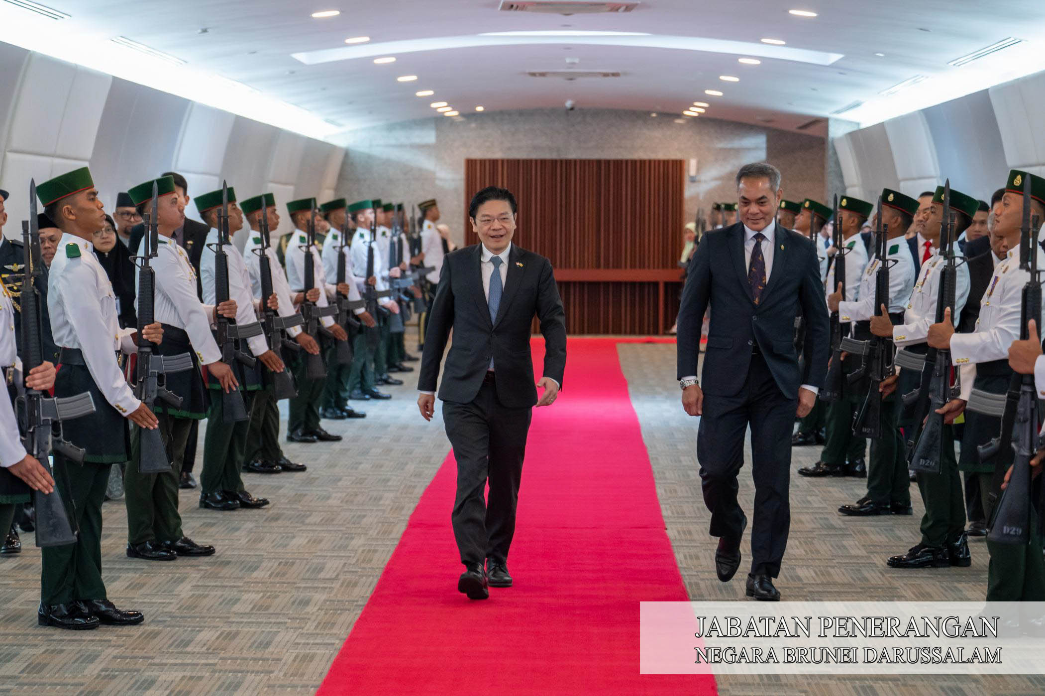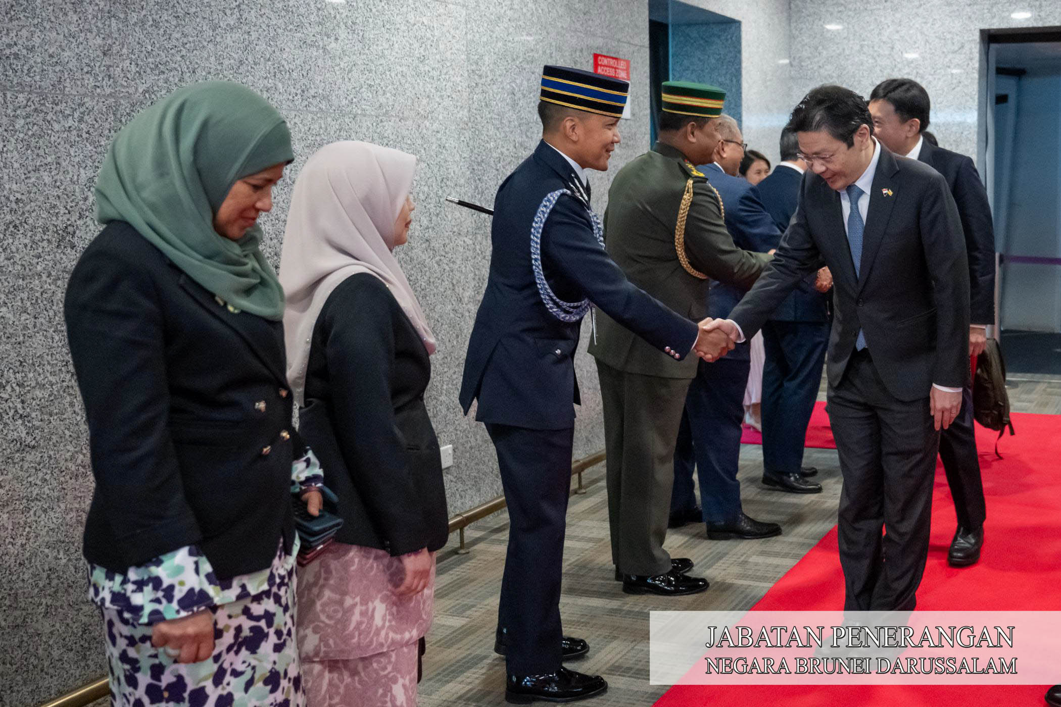 Sejurus ketibaan di Lapangan Terbang Antarabangsa Brunei, di sini, Tuan Yang Terutama Perdana Menteri dan Menteri Kewangan Republik Singapura diberi penghormatan dengan Barisan Kawalan Kehormatan Statik yang terdiri daripada anggota Angkatan Bersenjata Diraja Brunei (ABDB).