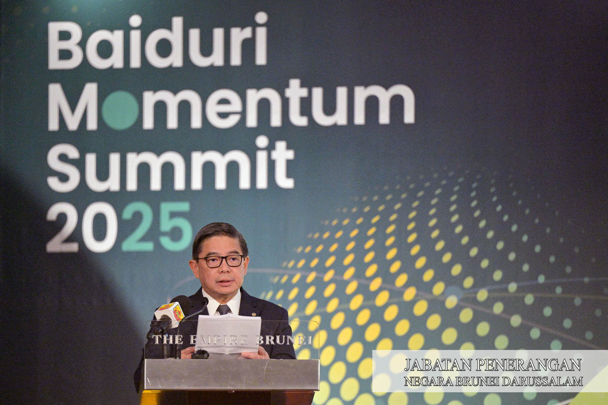 Menteri di Jabatan Perdana Menteri (JPM) dan Menteri Kewangan dan Ekonomi II, Yang Berhormat Dato Seri Setia Dr. Awang Haji Mohd. Amin Liew bin Abdullah berucap sedemikian pada Sidang Kemuncak Baiduri Momentum 2025 yang berlangsung di Indera Samudra, The Empire Brunei, hari ini.