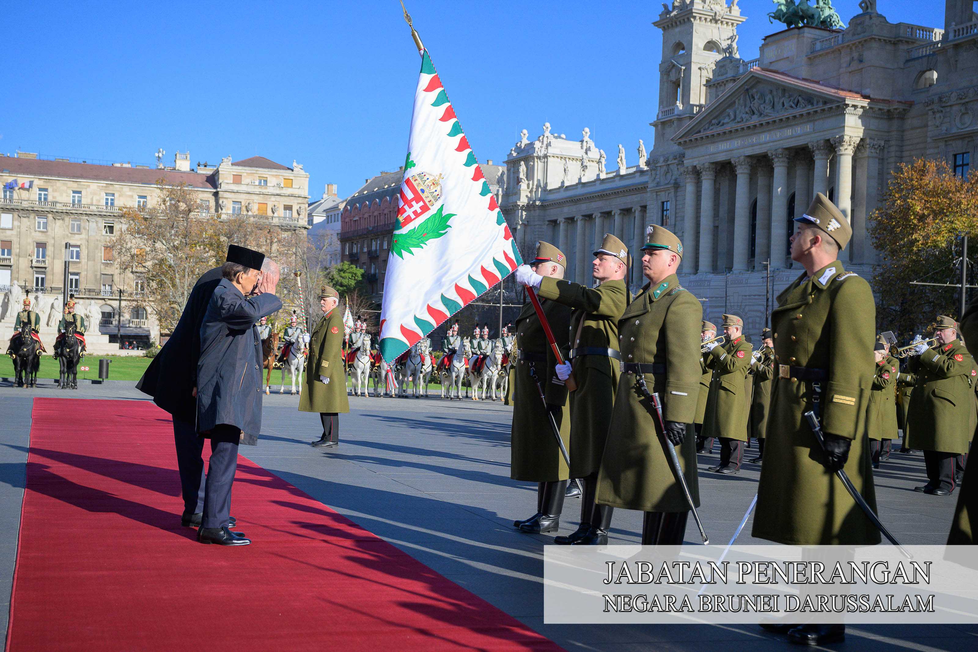 BUDAPEST, HUNGARY, Selasa, 18 November. - Kebawah Duli Yang Maha Mulia Paduka Seri Baginda Sultan Haji Hassanal Bolkiah Mu'izzaddin Waddaulah ibni Al-Marhum Sultan Haji Omar 'Ali Saifuddien Sa'adul Khairi Waddien, Sultan dan Yang Di-Pertuan Negara Brunei Darussalam, hari ini berangkat memulakan Keberangkatan Negara ke Hungary dengan menghadiri Majlis Sambutan Kenegaraan berlangsung di Kossuth Lajos Square, Budapest.