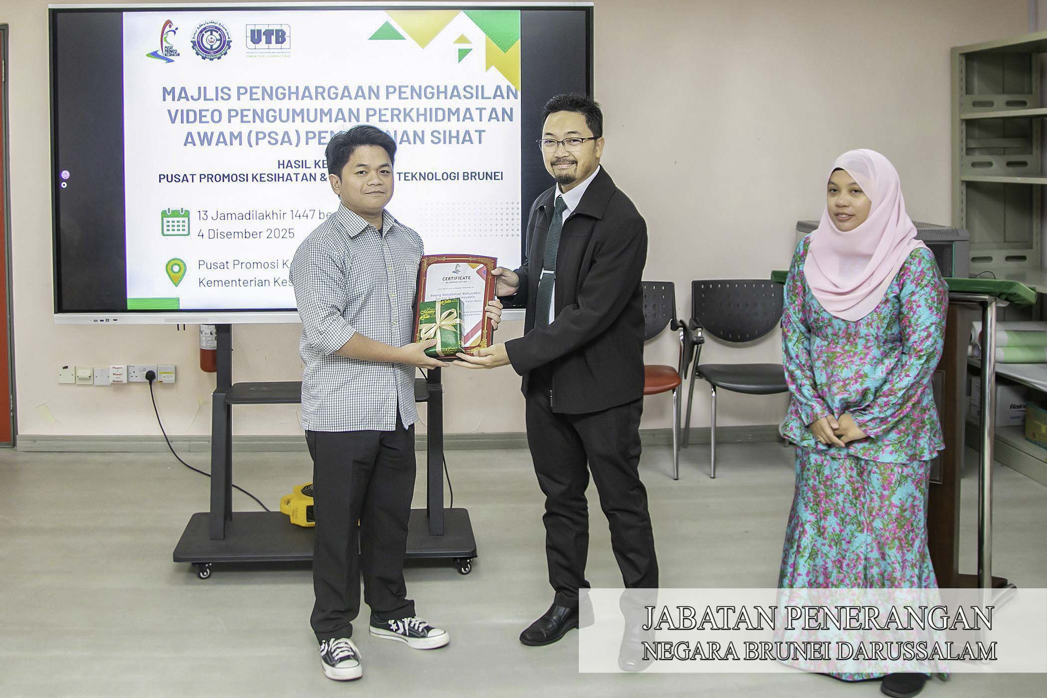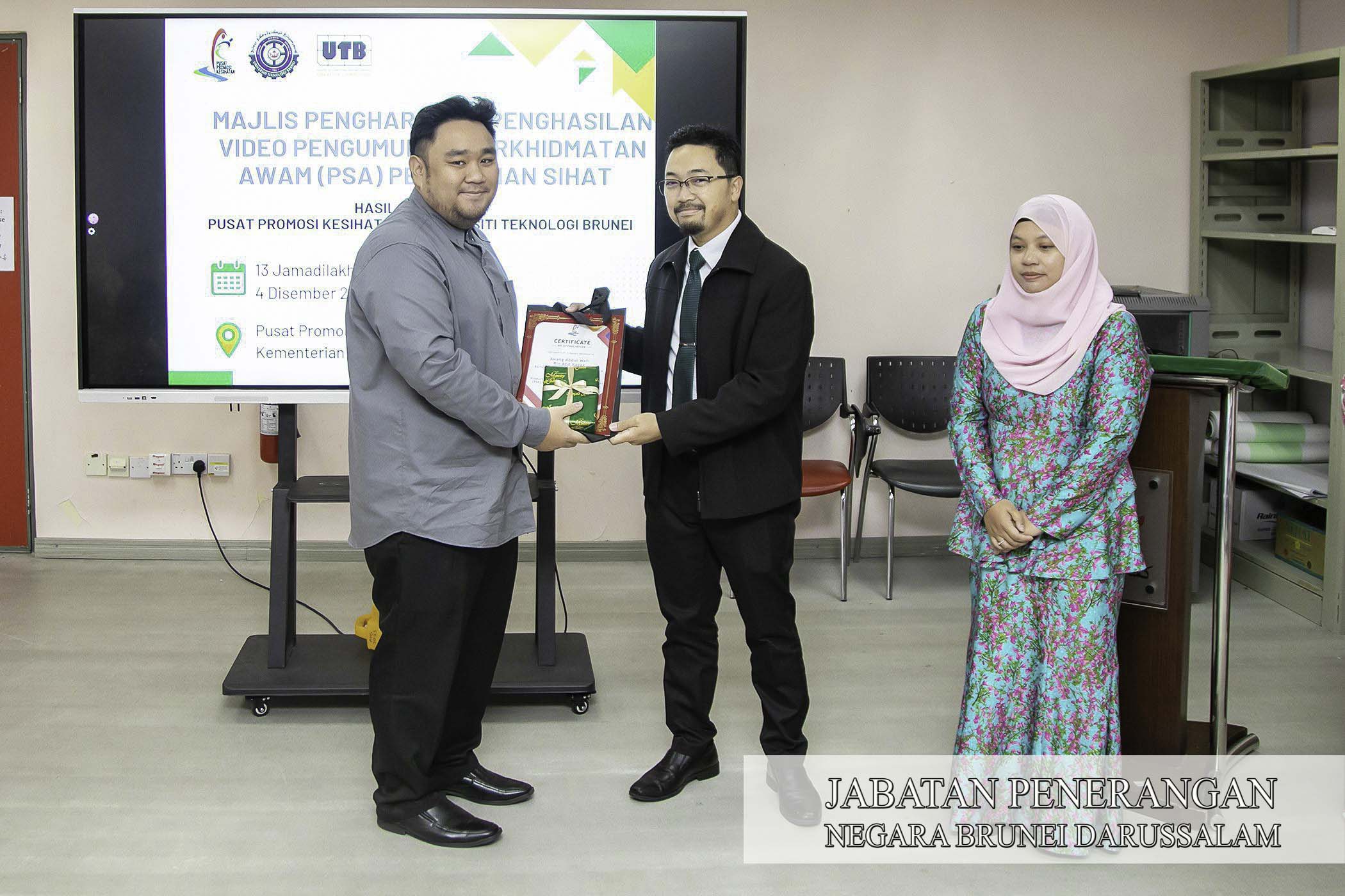 BERAKAS, Khamis, 4 Disember. - Pusat Promosi Kesihatan (PPK), Kementerian Kesihatan pagi tadi mengadakan Majlis Penghargaan Penghasilan Video Pengumuman Perkhidmatan Awam (PSA) Pemakanan Sihat, bertempat di Studio 2, PPK.