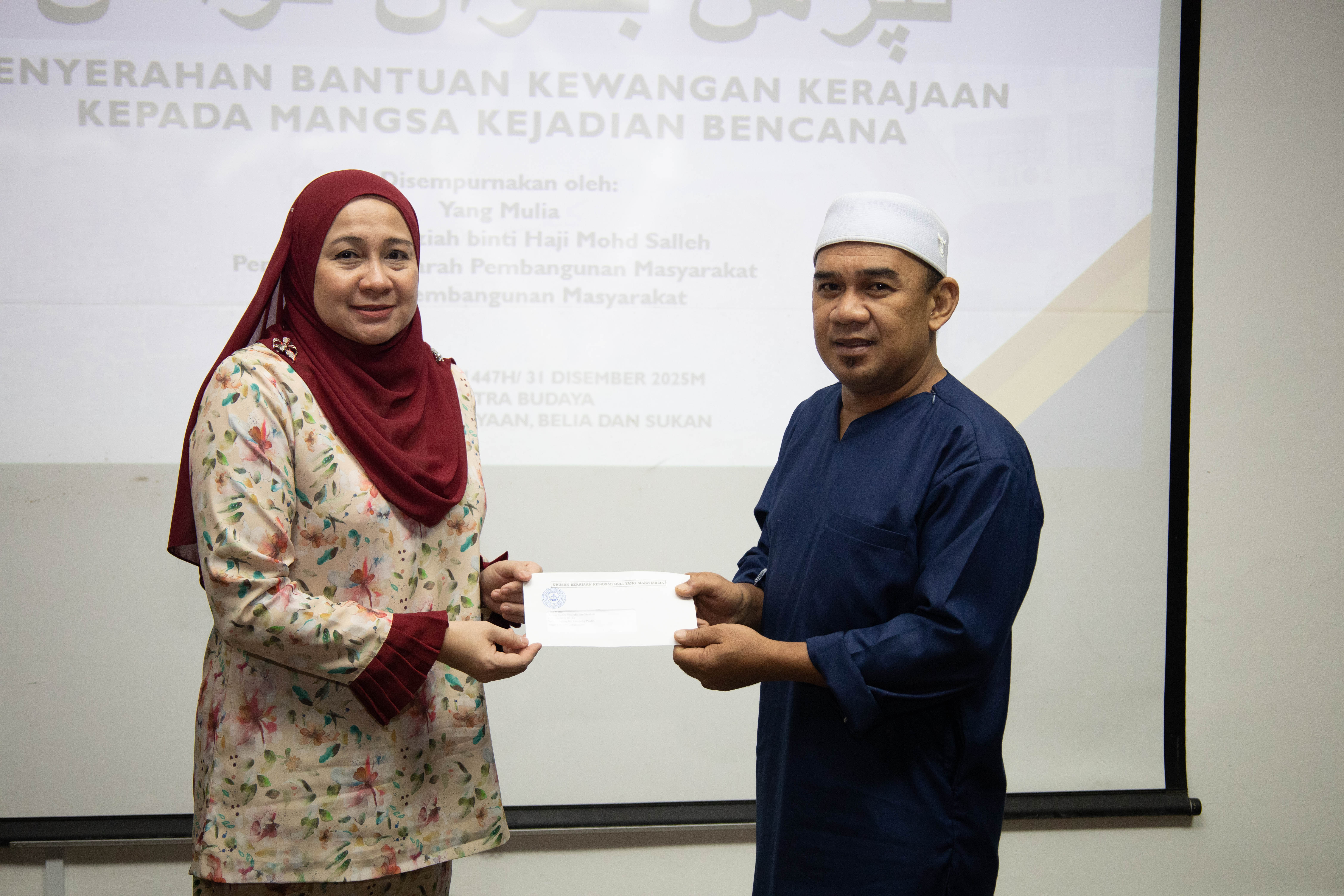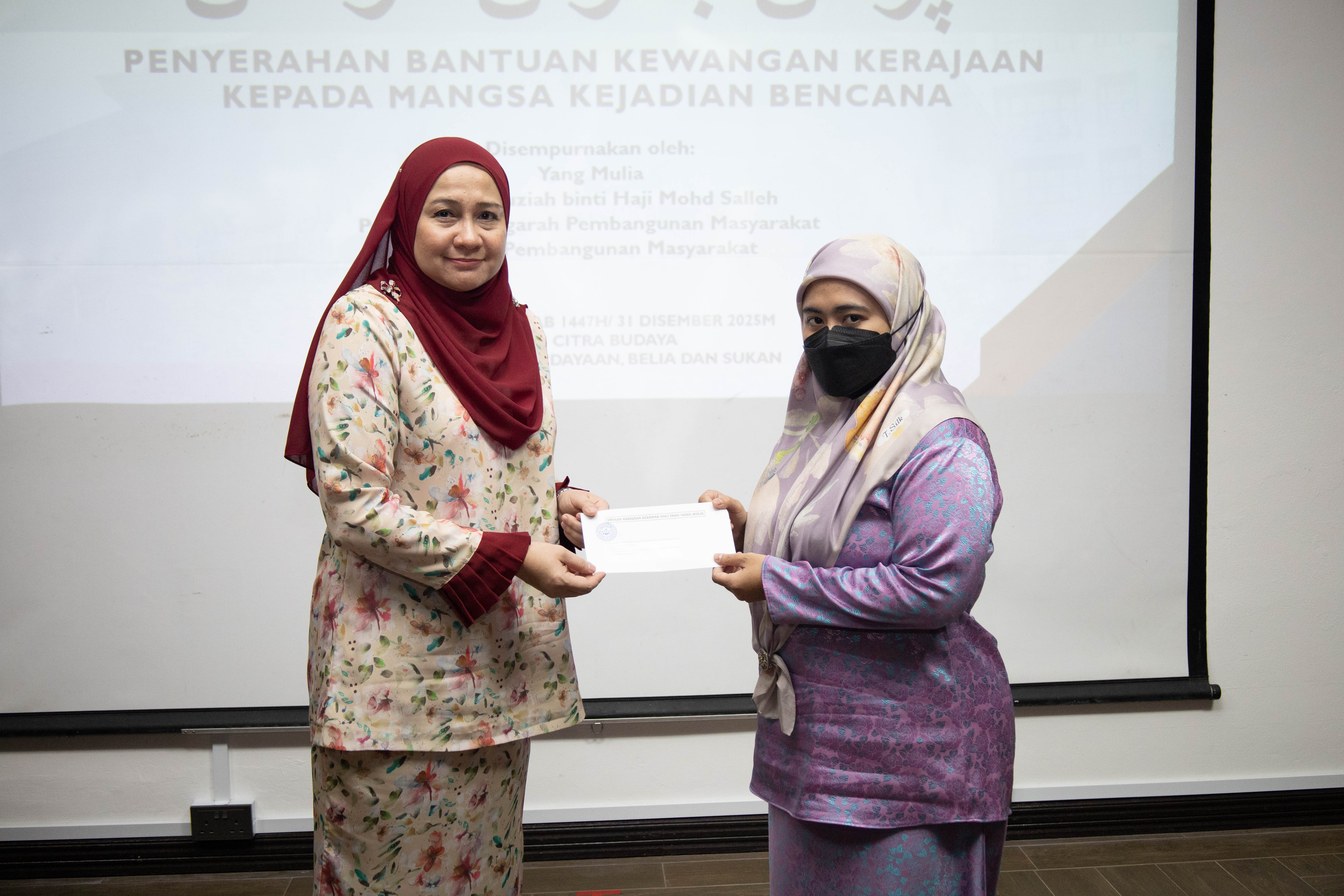BANDAR SERI BEGAWAN, Rabu, 31 Disember. - Kerajaan Kebawah Duli Yang Maha Mulia Paduka Seri Baginda Sultan dan Yang Di-Pertuan Negara Brunei Darussalam, melalui Jabatan Pembangunan Masyarakat (JAPEM), Kementerian Kebudayaan, Belia dan Sukan (KKBS), telah menyalurkan bantuan kewangan berjumlah keseluruhan BND9,625 kepada lapan orang ketua keluarga.