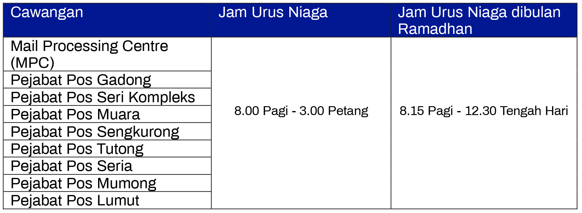 Sementara itu, bagi Mail Processing Centre (MPC) serta Pejabat Pos cawangan Gadong, Seri Kompleks, Muara, Sengkurong, Tutong, Seria, Mumong dan Lumut, akan beroperasi dari pukul 8.00 pagi hingga 3.00 petang, dan pada bulan Ramadan dari 8.15 pagi hingga 12.30 tengah hari.