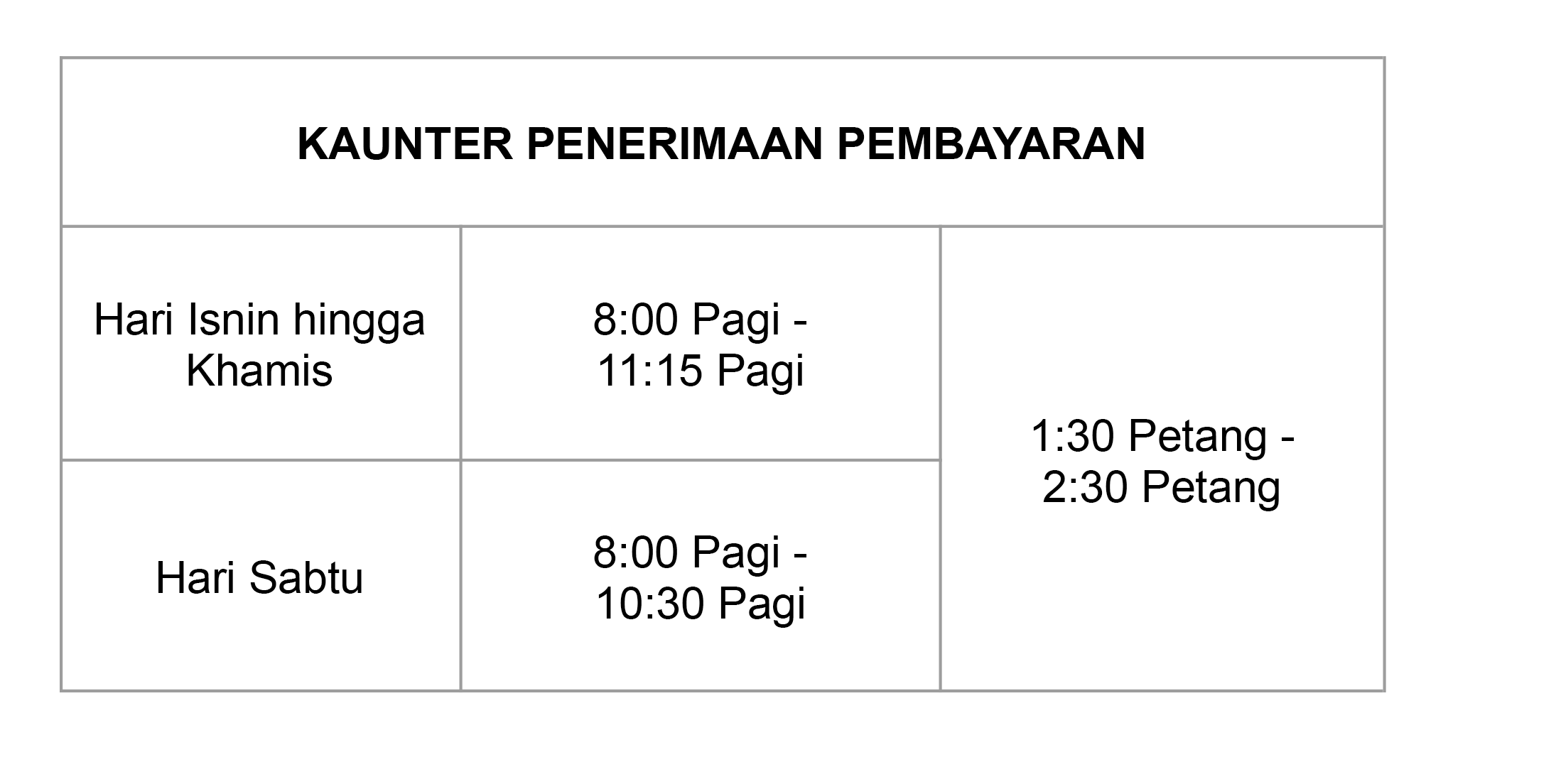 Pembayaran bolehlah dibuat melalui kaunter pembayaran di setiap Pejabat Tanah Daerah sewaktu operasi, iaitu pada Isnin hingga Khamis, bermula jam 08.00 pagi hingga 11.15 pagi dan 1.30 petang hingga 2.30 petang. Manakala pada Sabtu, bermula jam 8.00 pagi hingga 10.30 pagi dan 1.30 petang hingga 2.30 petang.