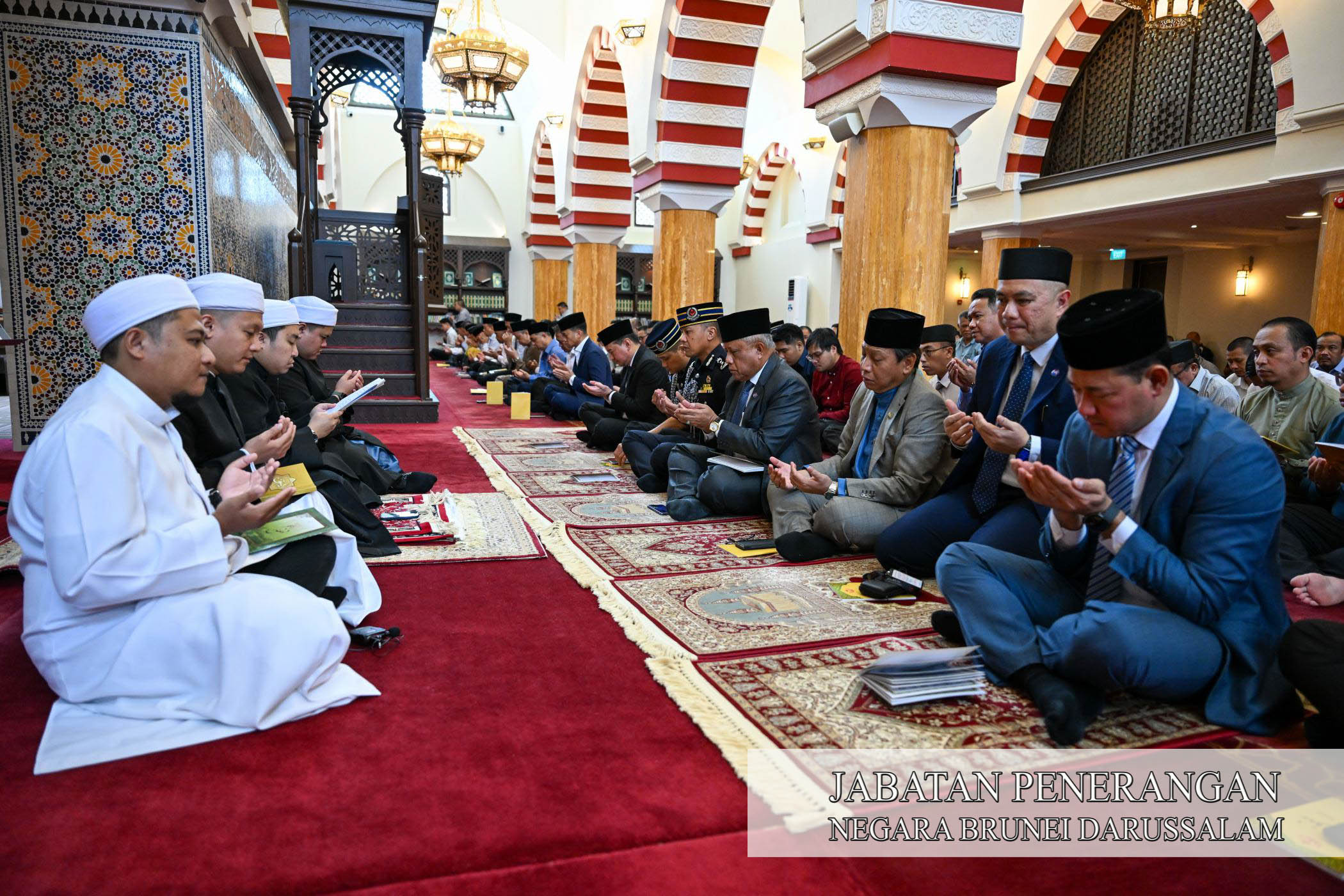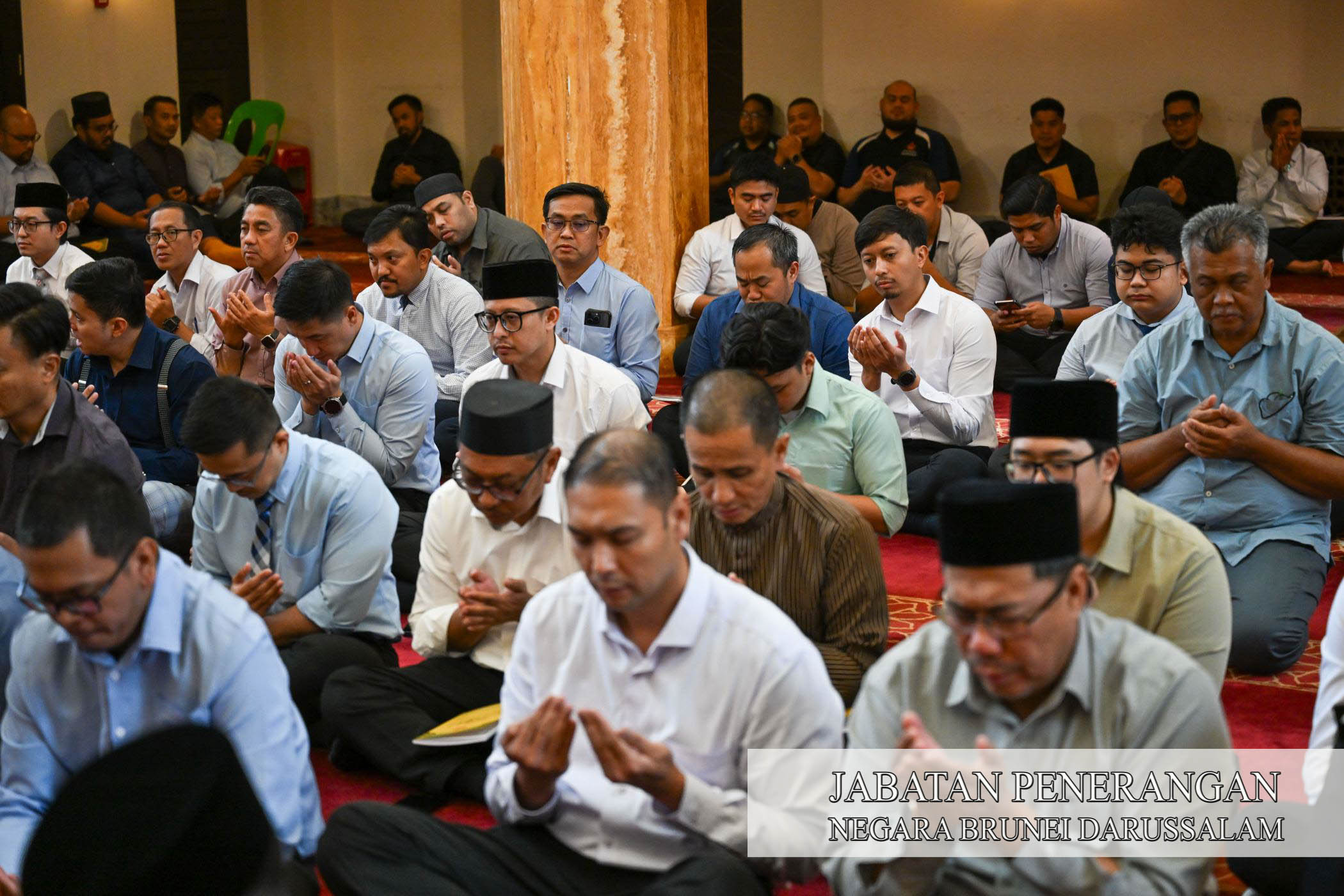 BERAKAS, Isnin, 19 Januari. - Jabatan Perdana Menteri (JPM) dan jabatan-jabatan di bawahnya mengadakan Majlis Sembahyang Sunat Hajat, Bacaan Surah Yaa Siin dan Doa Khas, hari ini, bagi merafakkan doa ke hadrat Allah Subhanahu Wata'ala untuk mengurniakan kesembuhan yang segera, kesihatan yang sempurna dan keafiatan yang berpanjangan kepada Kebawah Duli Yang Maha Mulia Paduka Seri Baginda Sultan Haji Hassanal Bolkiah Mu'izzaddin Waddaulah ibni Al-Marhum Sultan Haji Omar 'Ali Saifuddien Sa'adul Khairi Waddien, Sultan dan Yang Di-Pertuan Negara Brunei Darussalam.
