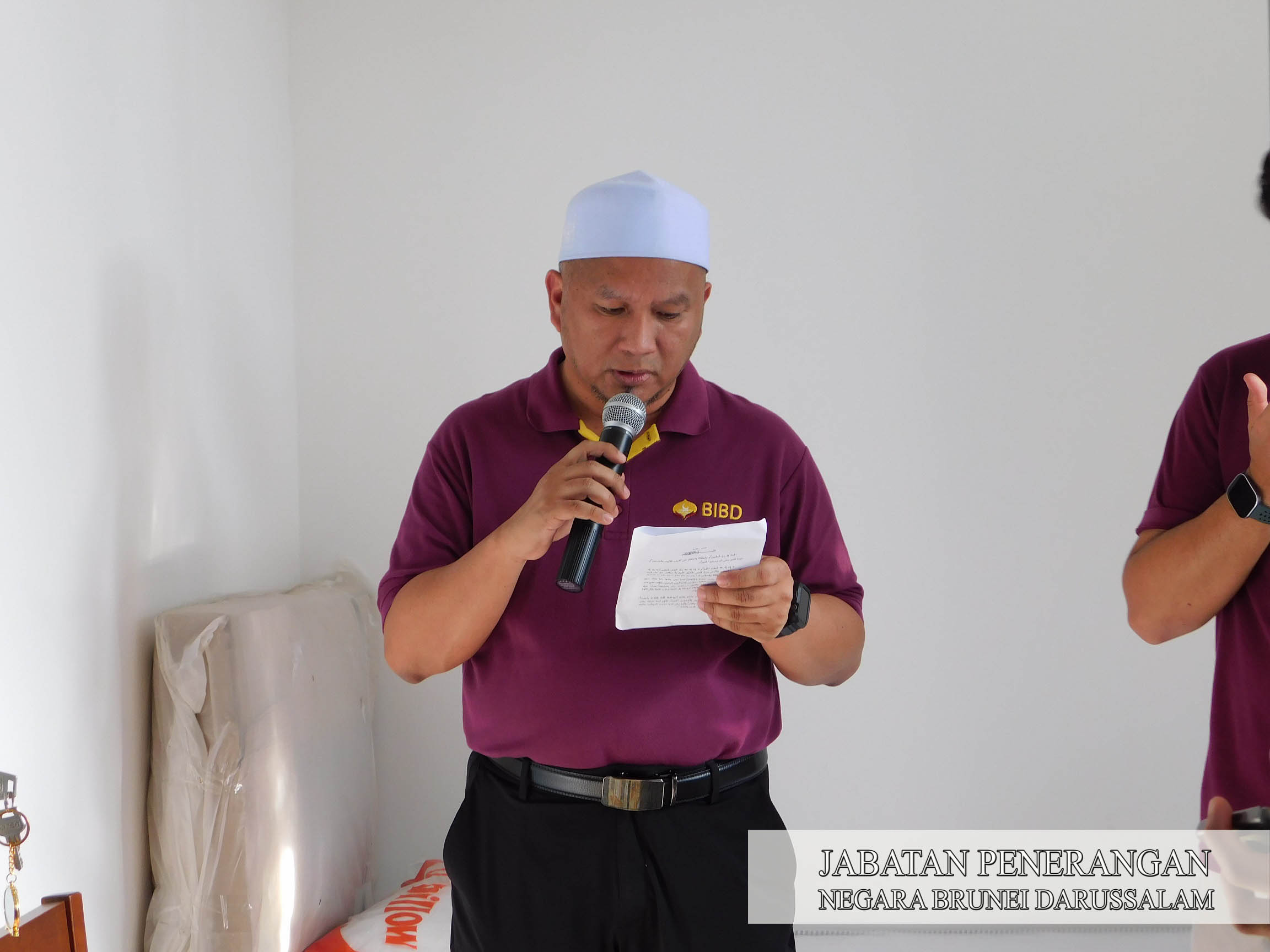 Hadir selaku tetamu kehormat majlis bagi menyempurnakan Majlis Penyerahan berkenaan, Menteri Hal Ehwal Dalam Negeri, Yang Berhormat Dato Seri Setia Awang Haji Ahmaddin bin Haji Abdul Rahman, selaku Pengerusi BIBD.