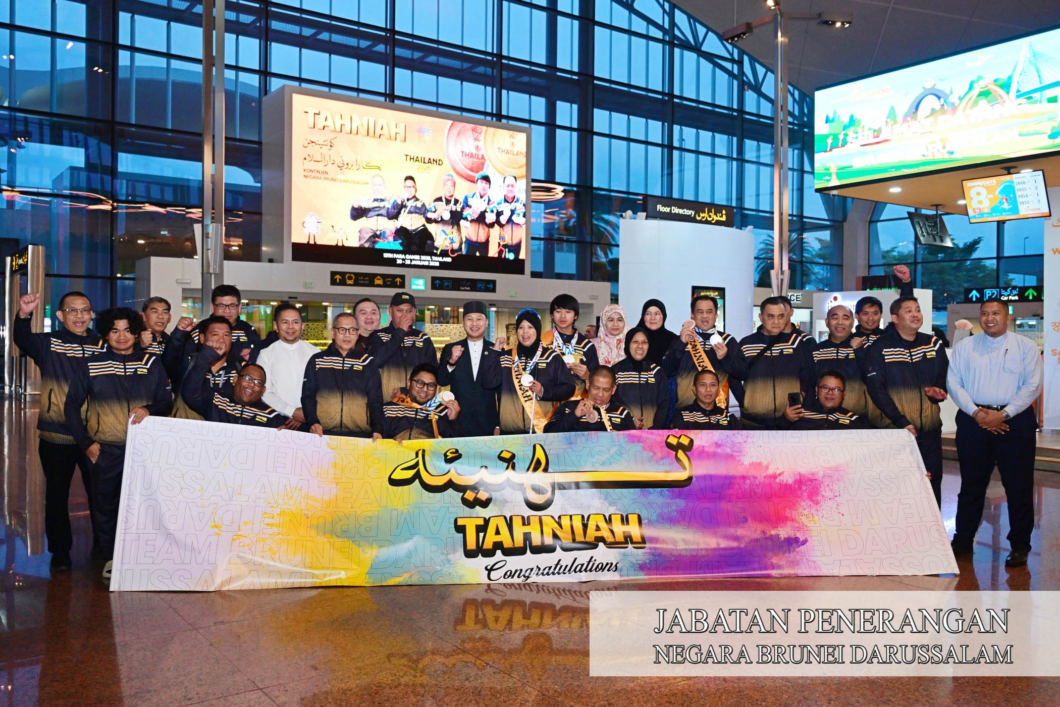 BERAKAS, Selasa, 27 Januari. - Seramai 21 ahli kontinjen Negara Brunei Darussalam (NBD) yang terdiri daripada 12 atlet dan sembilan pegawai termasuk Chef de Mission, Ketua Urus Setia, Pegawai Urus Setia atau Safeguarding, Fisioterapi, Jurulatih dan Penolong Jurulatih telah kembali ke NBD selepas berada di Nakhon Ratchasima, Thailand bagi menyertai kejohanan Sukan Para ASEAN Ke-13, Tahun 2025.