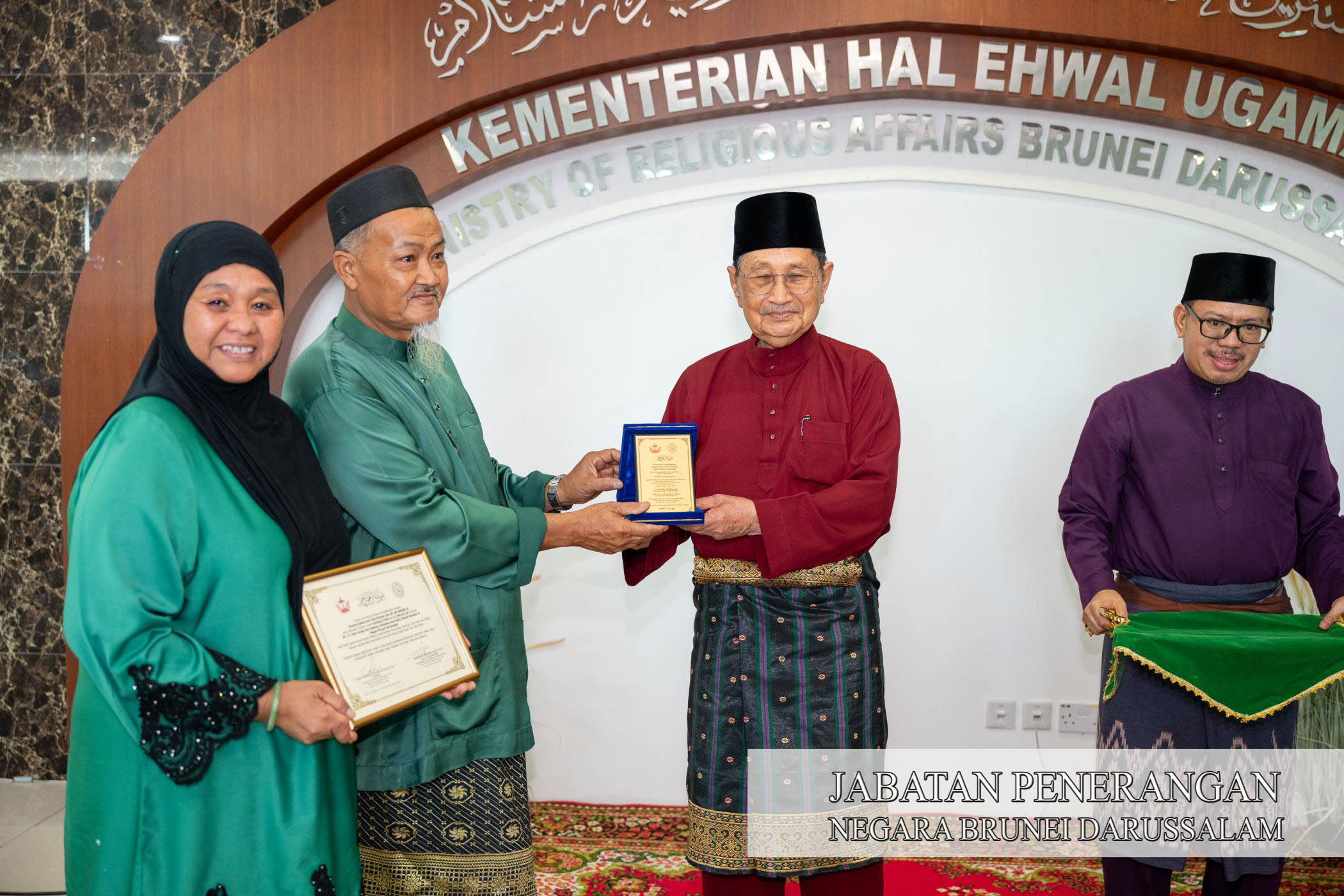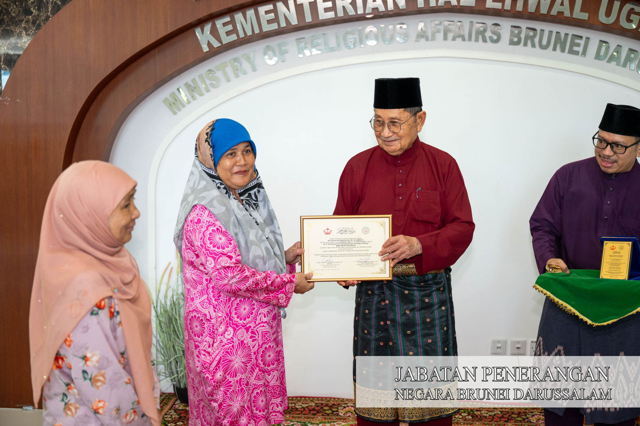 Sehubungan itu, Majlis Penyerahan Sijil Kesiapan Rumah dan Plak Rumah disempurnakan oleh Menteri Hal Ehwal Ugama, Yang Berhormat Pehin Udana Khatib Dato Paduka Seri Setia Ustaz Awang Haji Badaruddin bin Pengarah Dato Paduka Awang Haji Othman, selaku Yang Di-Pertua MUIB kepada lima orang penerima yang diadakan di Ruang Legar, Bangunan Tambahan, KHEU petang tadi.