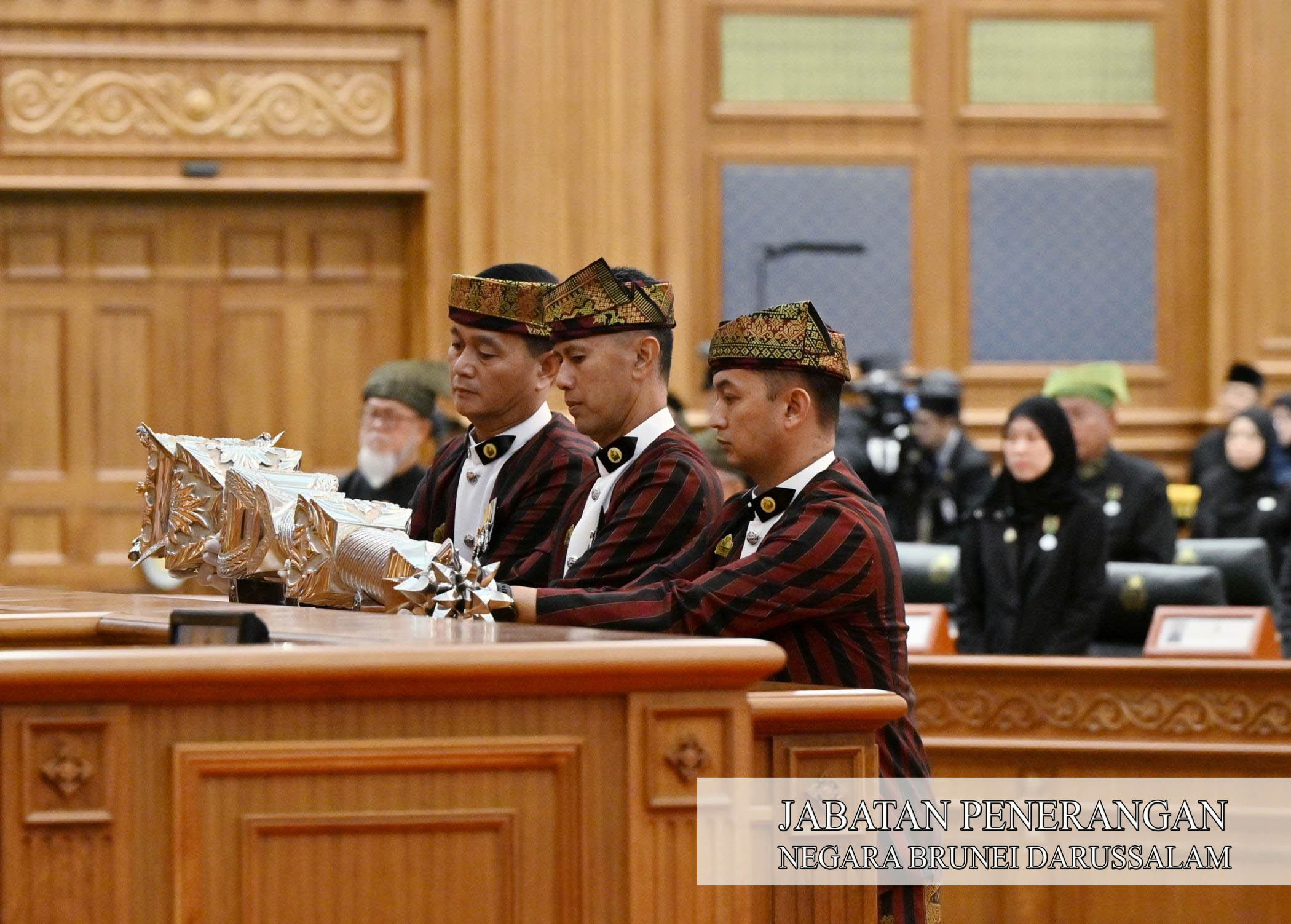 Keberangkatan tiba Kebawah Duli Yang Maha Mulia Paduka Seri Baginda Sultan Haji Hassanal Bolkiah Mu'izzaddin Waddaulah, Sultan dan Yang Di-Pertuan Negara Brunei Darussalam di Bangunan Dewan Majlis dijunjung oleh Yang Di-Pertua MMN, Yang Berhormat Pehin Orang Kaya Seri Lela Dato Seri Setia Awang Haji Abdul Rahman bin Dato Setia Haji Mohamed Taib; dan Jurutulis Majlis Mesyuarat Di-Raja, Setiausaha Majlis Mesyuarat Menteri-menteri Kabinet dan Jurutulis MMN, Datin Paduka Dr. Dayang Hajah Huraini binti Pehin Orang Kaya Setia Jaya Dato Paduka Awang Haji Hurairah.