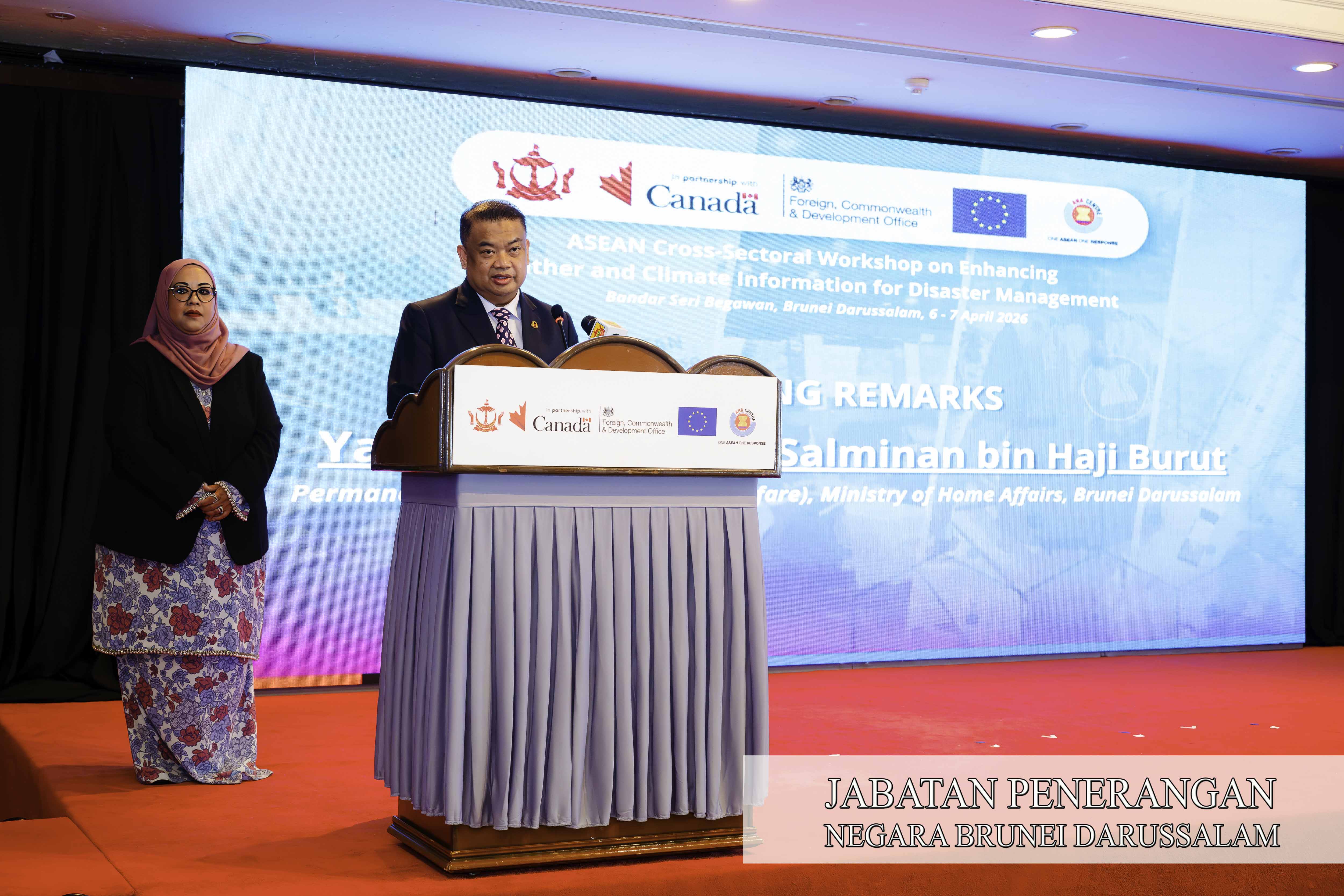 Perkara tersebut dinyatakan oleh Setiausaha Tetap (Keselamatan dan Kesejahteraan), Kementerian Hal Ehwal Dalam Negeri (KHEDN), Awang Salminan bin Haji Burut, selaku tetamu kehormat pada Majlis Pembukaan ASEAN Cross-Sectoral Workshop on Enhancing Weather and Climate Information for Disaster Management yang berlangsung di The Centrepoint Hotel, Gadong.