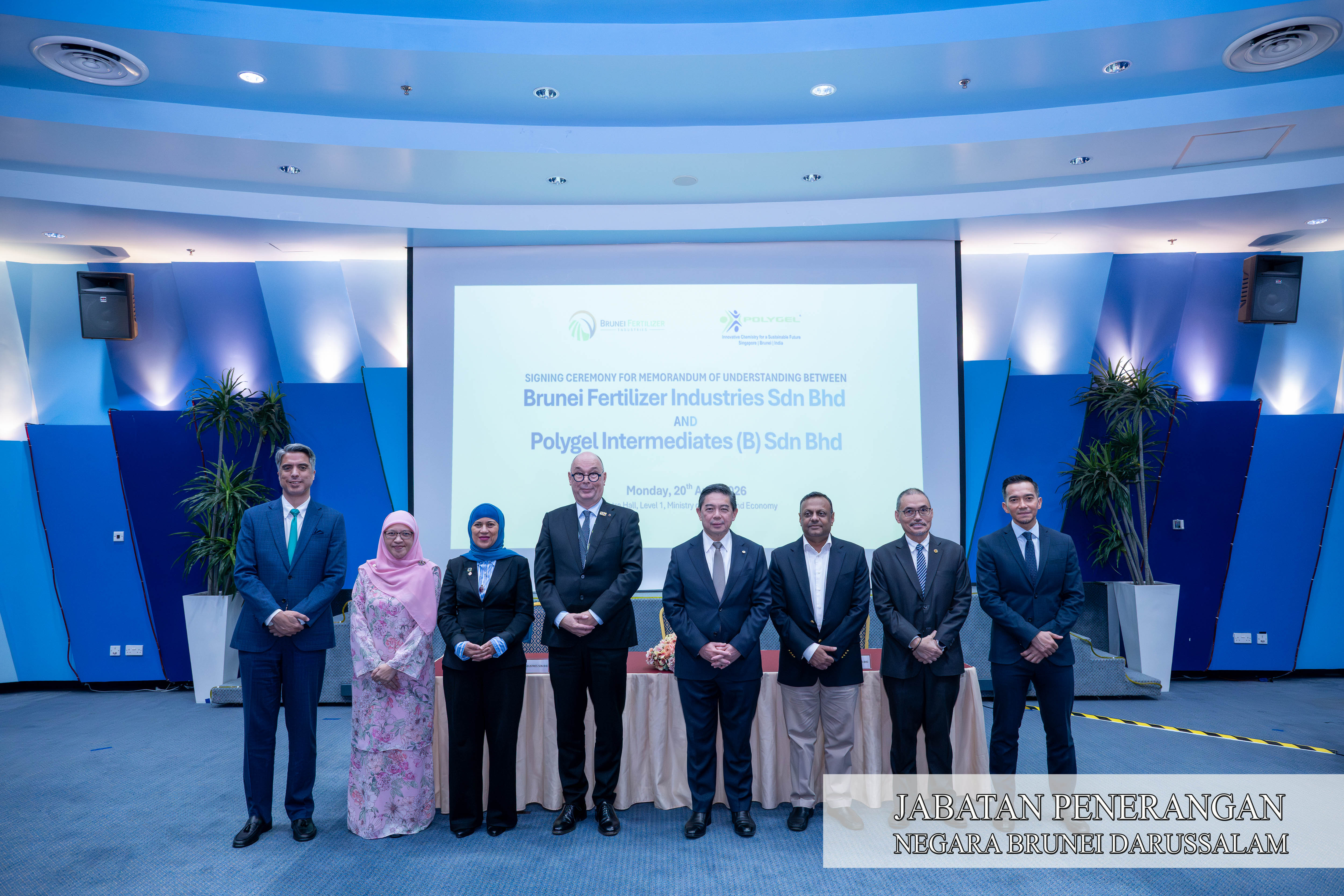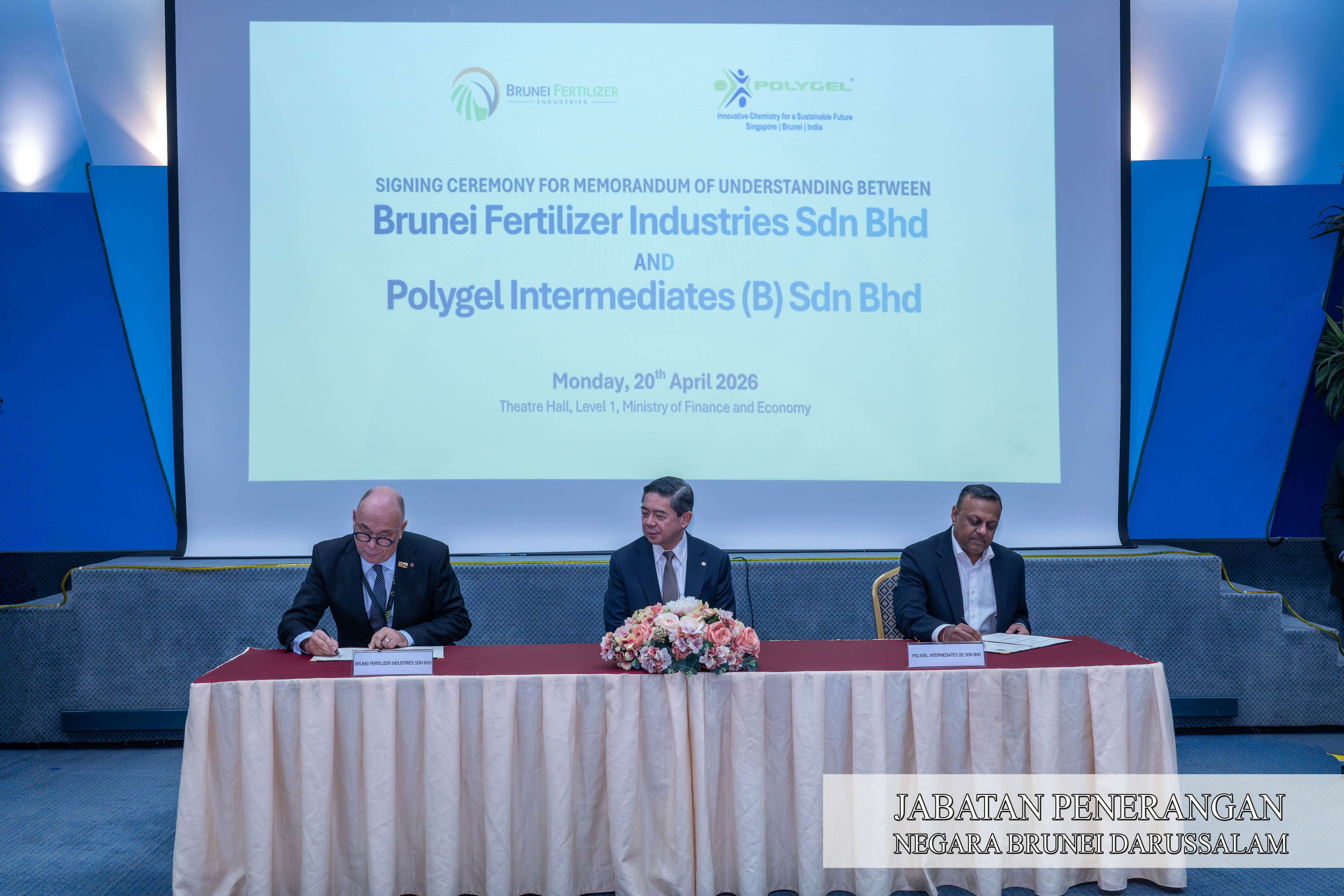 BANDAR SERI BEGAWAN, Isnin, 20 April. – Brunei Fertilizer Industries Sendirian Berhad (BFI) dan Polygel Intermediates (B) Sendirian Berhad (PIBSB) hari ini memeterai Memorandum Persefahaman (MoU) bagi mengukuhkan kerjasama strategik dalam pembangunan industri hiliran minyak dan gas negara.