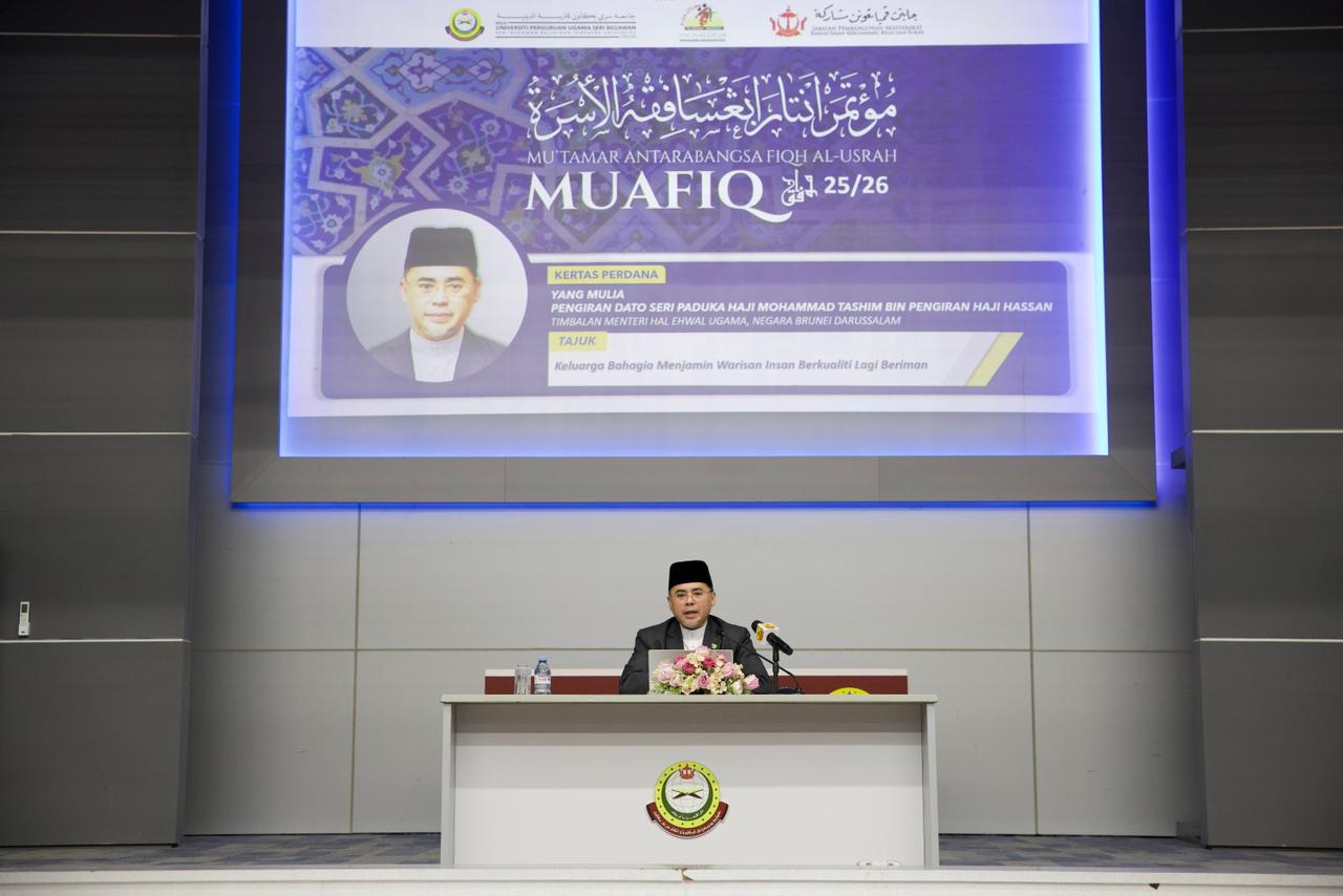 Perkara tersebut disampaikan oleh Timbalan Menteri Hal Ehwal Ugama, Yang Mulia Pengiran Dato Seri Paduka Haji Mohammad Tashim bin Pengiran Haji Hassan dalam Pembentangan Kertas Ceramah Perdana Mu'tamar Antarabangsa Fiqh Al-Usrah 2025 / 2026 (MUAFIQ 25 / 26), yang seterusnya menyempurnakan perasmian 'mu'tamar' berkenaan yang mengambil tempat di Dewan Tarbiah, Kolej Universiti Perguruan Ugama Seri Begawan (KUPU SB), pagi tadi.