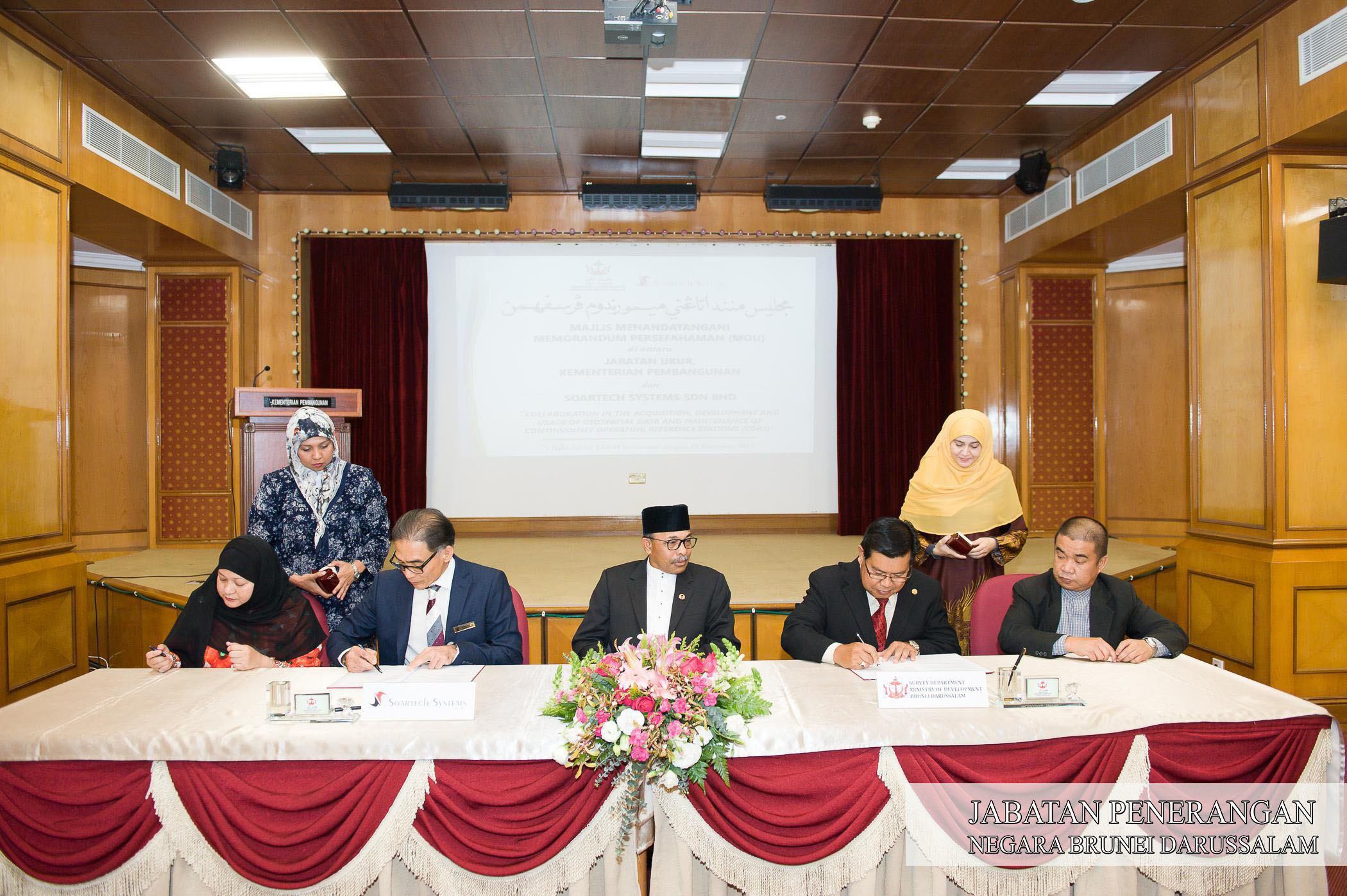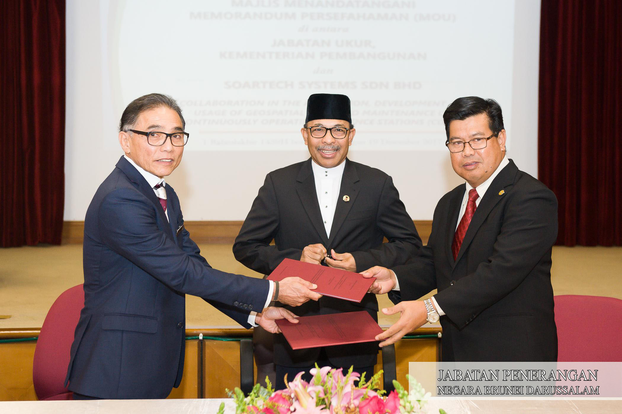 BANDAR SERI BEGAWAN, Selasa, 19 Disember. - Dalam mewujudkan kerjasama berbentuk Public, Private Partnership (PPP), satu Majlis Menandatangani Memorandum Persefahaman (MoU) - Collaboration In The Acquisition, Development and Usage of Geospatial Data and Maintenance of Continously Operating Reference Stations (CORS) di antara Jabatan Ukur, Kementerian Pembangunan dan Syarikat Soartech Systems Sendirian Berhad. Majlis berlangsung di Bilik Betabur, Kementerian Pembangunan, Berakas.